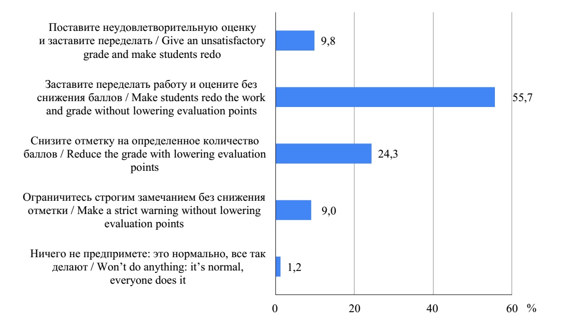Самым популярным способом реагирования преподавателей вуза на плагиат в работе студента является выставление неудовлетворительной оценки с возможностью переписать работу (64 %), т. е. достаточно мягкая мера, что свидетельствует о высокой терпимости профессорско-преподавательского состава к подобным нарушениям [24].