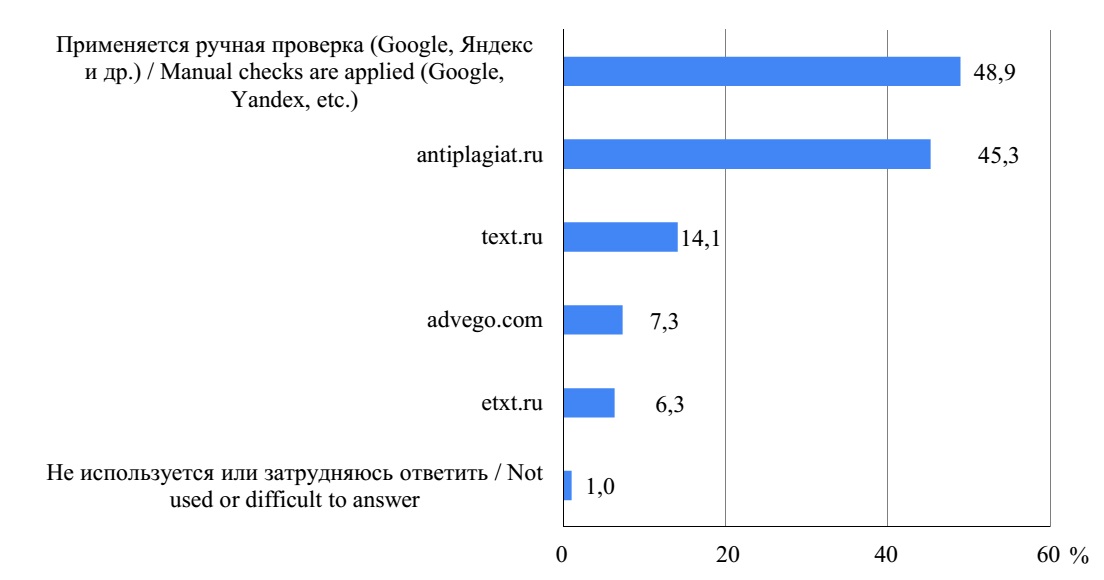 Авторы отмечают положительную динамику распространенности в российских вузах практики проверки студенческих работ на наличие плагиата: в 2020 г. всего 9 % опрошенных преподавателей отметили отсутствие такой проверки в их вузе (в 2017 г. – 12 %) [24].