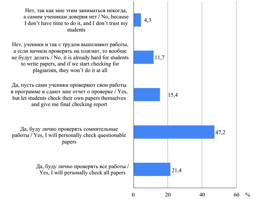 Отметим, что при столь высокой информированности педагогического сообщества на практике проверка работ старшеклассников на наличие плагиата мало распространена.