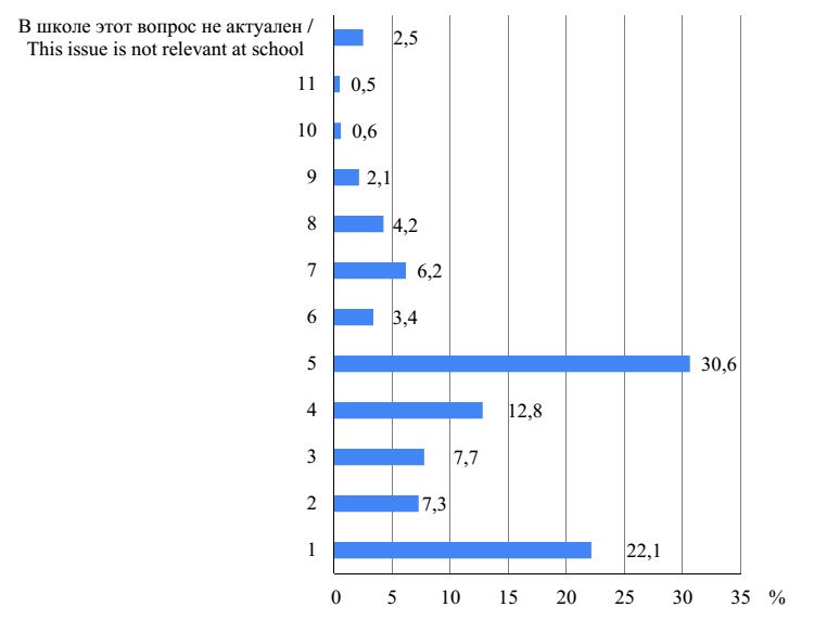 Учителям был задан вопрос «Есть ли в Вашем образовательном учреждении компьютерная проверка работ старшеклассников на наличие плагиата?», на который получены следующие ответы: 42,8 % отметили, что «обязательной проверки работ нет, но я делаю это самостоятельно», 30,8 % – выбрали вариант «нет, такие проверки не проводятся, и я лично также их не делаю», 11,4 % – указали, что «все работы старшеклассников проходят компьютерную проверку на наличие плагиата», 15 % остановились на варианте «некоторые работы проходят компьютерную проверку на наличие плагиата». Таким образом, в большинстве школ проверки либо не проводятся, либо основаны на личной инициативе отдельных учителей, т. е. носят бессистемный характер.
