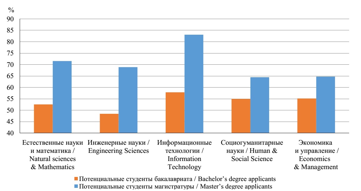 Materials and Methods. The answers to these questions are based on empirical research data: the results of an online survey conducted in 2021–2022 among full-time undergraduate and graduate applicants to one of the largest Russian universities; additional surveys conducted by the authors in 2015 (using a similar methodology); semi-structured interviews conducted at the end of the academic year with first-year students from among those surveyed in the quantitative study in 2021, university graduates (using a similar methodology); semi-structured interviews conducted at the end of the academic year with first-year students from among those surveyed in the quantitative research in 2021, university graduates working in the digital sphere in 2021.