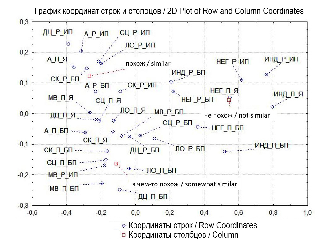 Процедура. Обработка полученных данных осуществлялась посредством применения методов описательной статистики, сравнительного анализа с использованием критериев Манна – Уитни, Крускала – Уоллиса и Вилкоксона, корреляционного анализа с использованием коэффициента ранговой корреляции Спирмена, анализа соответствий и факторного анализа. Анализ соответствий был применен к совокупности оценок инклюзивных диспозиций, полученных от педагогов и родителей применительно к трем образам педагога: типичного, идеального и, в случае с педагогами, самого себя; при этом оценки переводились в трехуровневую шкалу («не похож», «в чем-то похож», «похож»). Факторный анализ с вращением Варимакс проводился для сравнения структуры инклюзивных диспозиций и установок в отношении инклюзивного образования в исследуемых группах.