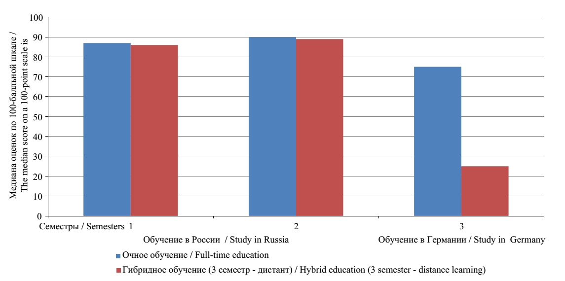 За три года реализации совместной программы немецкими коллегами была отмечена относительно низкая успеваемость российских студентов, по сравнению с их сверстниками из других стран. Причем в год второй волны пандемии COVID-19 (осень 2020 – весна 2021 гг.), когда студенты по ходу обучения перешли с очного на гибридное (с преобладанием удаленного) обучение, продолжая при этом жить в Германии, ситуация стала особенно критичной (рис. 1).