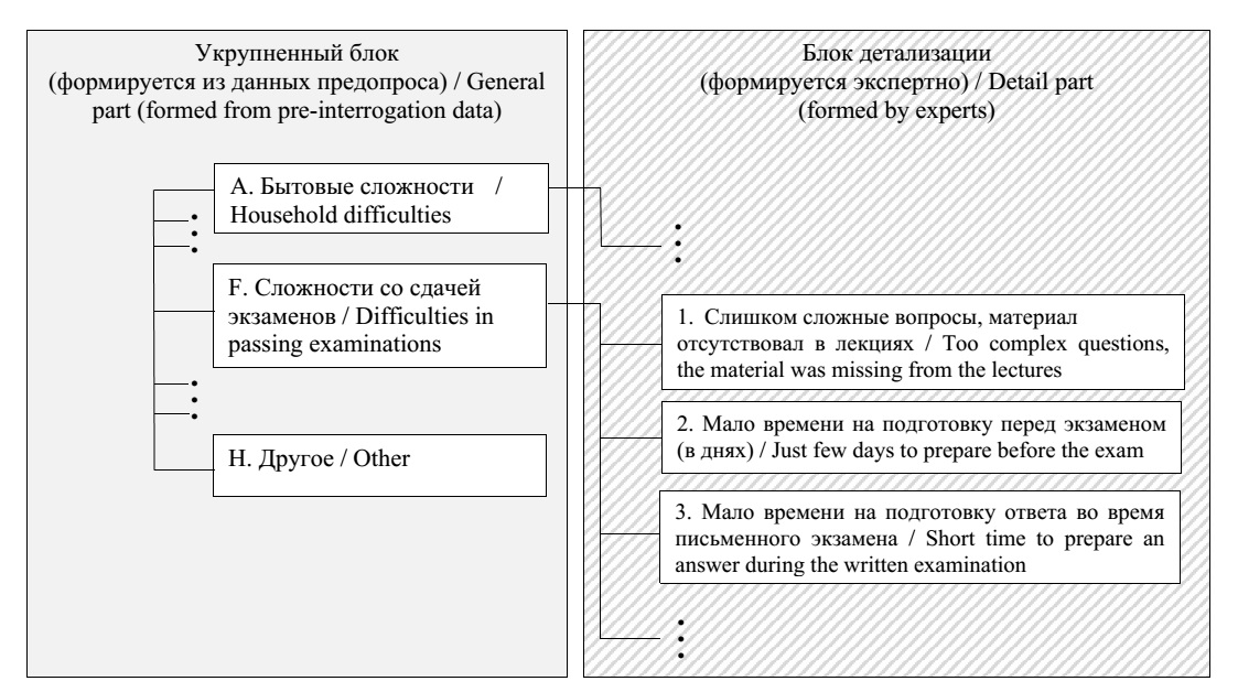 Исследование влияния проблемных блоков с детализацией. Наибольшие трудности, как показал первый этап исследований, у студентов вызывают блоки «F. Сложности со сдачей экзаменов» и «G. Сложности с выполнением практических заданий» (24 и 22 % относительного негативного влияния соответственно). Уточняющие вопросы по блоку F включали в себя следующие: