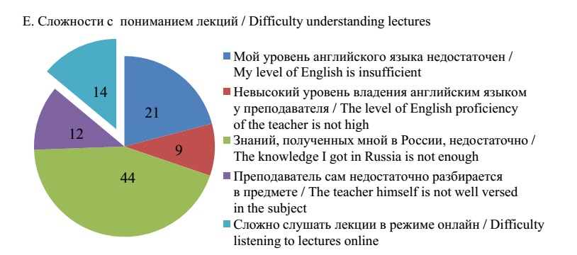 Весомый вклад в оценку основных причин снижения успеваемости обучающихся в германском вузе в период пандемии COVID-19 вносят свободные ответы студентов периода локдауна в разделах «Другое». В частности, выделяются психологические трудности и проблемы с получением информации об электронных ресурсах (информационных системах) университета Кайзерслаутерна, на платформе которых проводились все занятия и экзамены. Вероятная причина – специфика обучения в ГРИНТ: в отличие от других иностранных студентов, которые к третьему курсу уже освоились в ТУК и знают обо всех (в том числе и электронных) ресурсах университета, студенты ГРИНТ приезжают в Кайзерслаутерн в середине двухгодичного обучения, и им требуется некоторое время, чтобы узнать от преподавателей и сокурсников то, что их товарищи знают уже давно. На фоне пандемии социальные контакты студентов, как личные, так и онлайн [30], еще более сузились. Это затронуло и российских студентов ГРИНТ в Германии. Как результат, информация доходила до студентов из России критически медленно, что привело к информационной изоляции и пропуску многих теоретических и практических занятий в начале обучения.