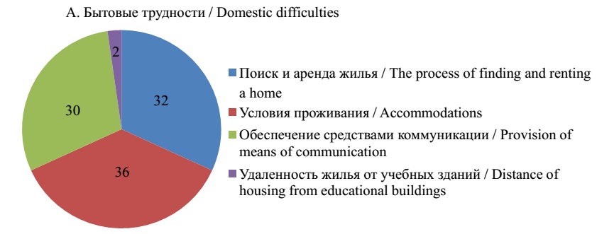 В качестве причины недостатка времени на подготовку перед экзаменом практически все студенты отмечали разницу в форме письменного экзамена в России и Германии. Так, один из студентов комментирует: «Непривычный формат экзамена. В России в билете всего 2 вопроса, и на них нужно ответить развернуто… В Германии же дается всего полтора часа на несколько листов с вопросами. Ответить необходимо коротко, …и при этом там не только теоретические вопросы, но и вычислительные задания» (здесь и далее стилистика, орфография и пунктуация ответов сохранена ‒ ред.). Это подтверждает гипотезу российских преподавателей о значительном влиянии различий в национальных системах образования на успеваемость. Для уменьшения негативного влияния данного фактора российских студентов необходимо готовить к ожидающему их за границей формату итогового контроля. Интересен также комментарий от студента удаленной формы обучения относительно организационных сложностей экзаменов: «Даты экзаменов приходятся на момент отъезда из Германии (даты экзамена и отъезда отличались на 2 дня2). Необходимо (одновременно) и готовиться к экзамену, и решать множество организационных вопросов: идти в мэрию снимать регистрацию, закрывать все договоры (договор аренды жилья, договор обслуживания интернета, договор банковского обслуживания, страхования жизни и здоровья и т. д.)». Здесь речь идет скорее о бытовых сложностях (укрупненный раздел А) и их взаимосвязи с учебным процессом, что частично проясняет, каким образом данный вид трудностей оказался для студентов на третьем месте по негативному влиянию на процесс обучения в Германии (детализация укрупненного раздела А будет дана ниже). Необходимость отъезда во время сессии вызвана условиями грантодателя по продолжительности обучения наших студентов в Германии. ТУК поддерживает студентов, разрешая сдавать письменные экзамены удаленно уже после возвращения в Россию. Экзамен в таком случае проходит в смешанном формате, на тех же условиях, что и для студентов из Германии. Однако для учебного процесса было бы лучше, если бы российские студенты имели возможность закрывать сессию очно в ТУК.