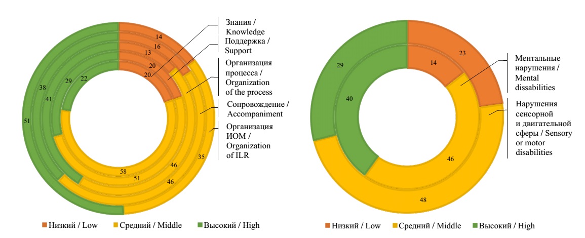 В наименьшей степени сформированы инклюзивные компетенции преподавателей, связанные с психолого-педагогической поддержкой детей с ОВЗ (уровни: высокий – 29,32 %, средний – 50,99 %, низкий – 19,69 %) и комплексом содержательных и инструментальных знаний об особенностях психического и возрастного развития, характере учебной деятельности таких детей (уровни: высокий – 22,53 %, средний – 57,87 %, низкий – 19,60 %). Обнаруживается недостаточность понимания педагогами особенностей ребенка с ОВЗ, его семейного окружения, а также знаний специализированных инструментов работы с таким ребенком. При этом преподаватели проявляют более высокий уровень компетенций в работе с детьми с ментальными нарушениями (уровни: высокий – 40,04 %, средний – 45,53 %, низкий – 14,43 %), тогда как при работе с детьми, имеющими нарушения сенсорной и двигательной сферы, педагоги чаще испытывают затруднения и демонстрируют недостаточный уровень сформированности профессиональных компетенций (уровни: высокий – 28,98 %, средний – 48,21 %, низкий – 22,81 %).