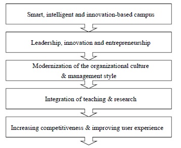 Figure 2 that follows sets a digital transformation pathway for universities and HEIs that can be done in five easy steps. For better clarity, this pathway represented in Figure 2 can be explained as follows: First, any university, HEI or college (a tertiary educational institution in the American perception of this term) needs to start with a smart and innovation-based campus that would encompass the support of start-ups and innovative ideas (a good example might be the University of Cambridge imposes this strategy and is often called an “entrepreneurial university”). Second, the first step should be reinforced with leadership and fostering the entrepreneurial approaches and ideas. Third, the above changes would inevitably lead to the modernization of organizational culture and the style of management applied both to the educational process and to the research. Fourth, the integration of teaching and research should be done in order to yield better and commercially applicable results. Finally, the fifth step which is the result of the four previous steps is the increase in the competitiveness and the improvement of user (students, lecturers, and researchers) experience with regard to teaching and research activities (see Figure 2).