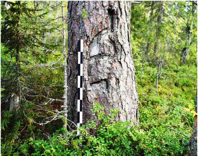 Второе карсикко (мощная сосна диаметром 0,65 м) располагается около южного входа, в 9,5 м к востоку от канала. Как и в первом случае, на стволе дерева со стороны канала вырублен фигурный знак петлевидной формы (60 × 25 см), вероятно, родовая фамильная тамга и под ним – отделенная небольшой перемычкой вырубка-«полочка» размерами 15 × 8 см. В корневой южной части ствола находится небольшой затес. К дереву от канала ведет тропинка (рис. 3).