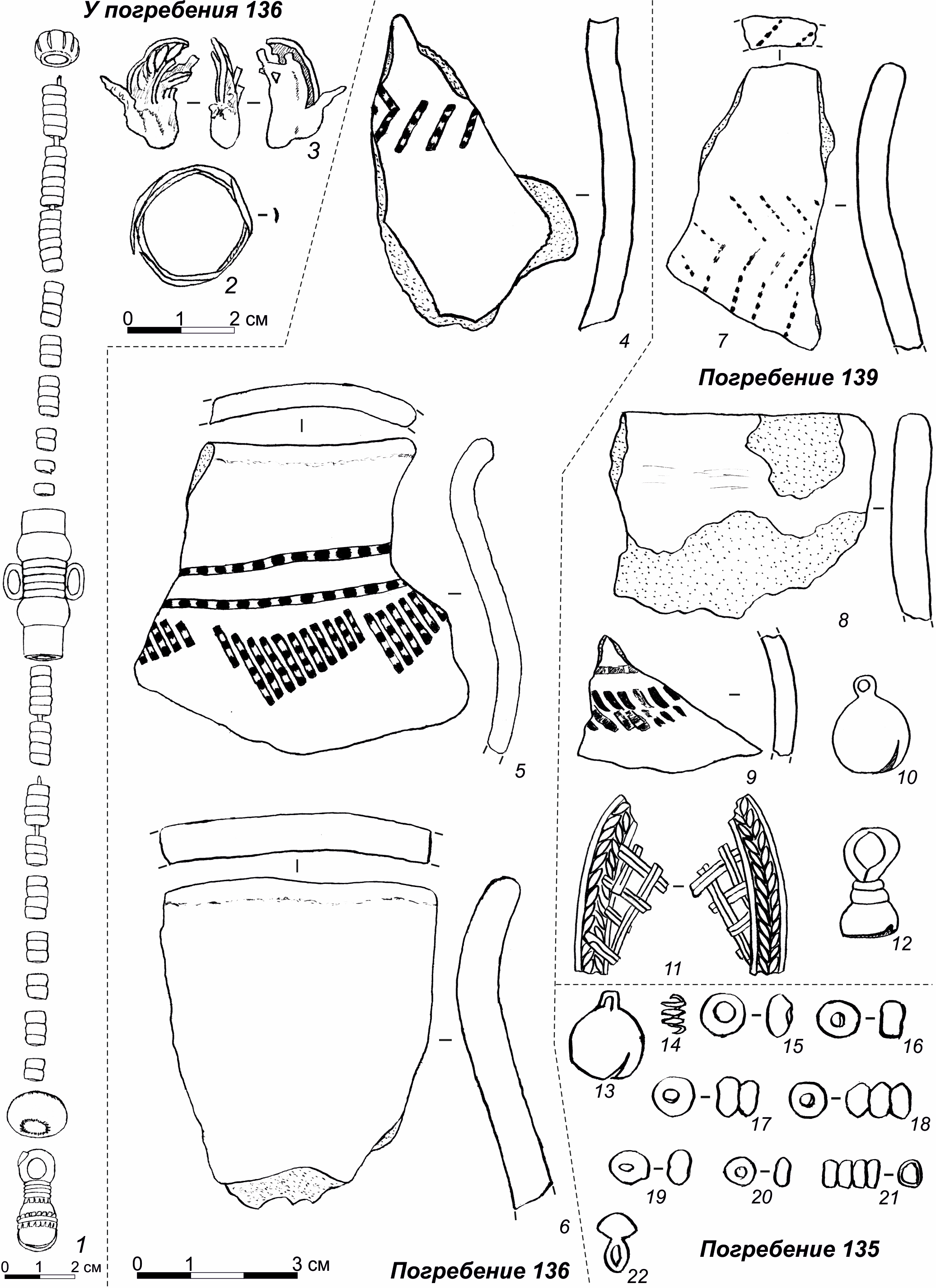 Соседнее погребение 135 содержит многочисленный инвентарь, значительная часть которого носит следы сильного обжига. Найдены три грибовидные пуговицы, два шаровидных бубенчика с линейной прорезью, спиралевидная пронизка, 12 оплавившихся деформировавшихся украшений, не поддающихся определению, каплевидные слитки металла, 27 бусин, среди них четыре бронзовые кольцевидные, спекшиеся, остальные – стеклянные: мелкие зонные, три сдвоенные, одна строенная, тонкий железный стерженек, возможно, шило, бронзовая пластинка, обломки железных предметов и многочисленные фрагменты двух или трех сосудов (рис. 4, 13-22). Выделяются фрагменты двух крупных чашевидных неорнаментированных сосудов и фрагмент венчика сосуда, орнаментированного по торцу и плечику наклонными рядами оттисков зубчатого штампа. В формовочной массе сосудов примесь крупнотолченой дресвы (рис. 5, 1, 2).