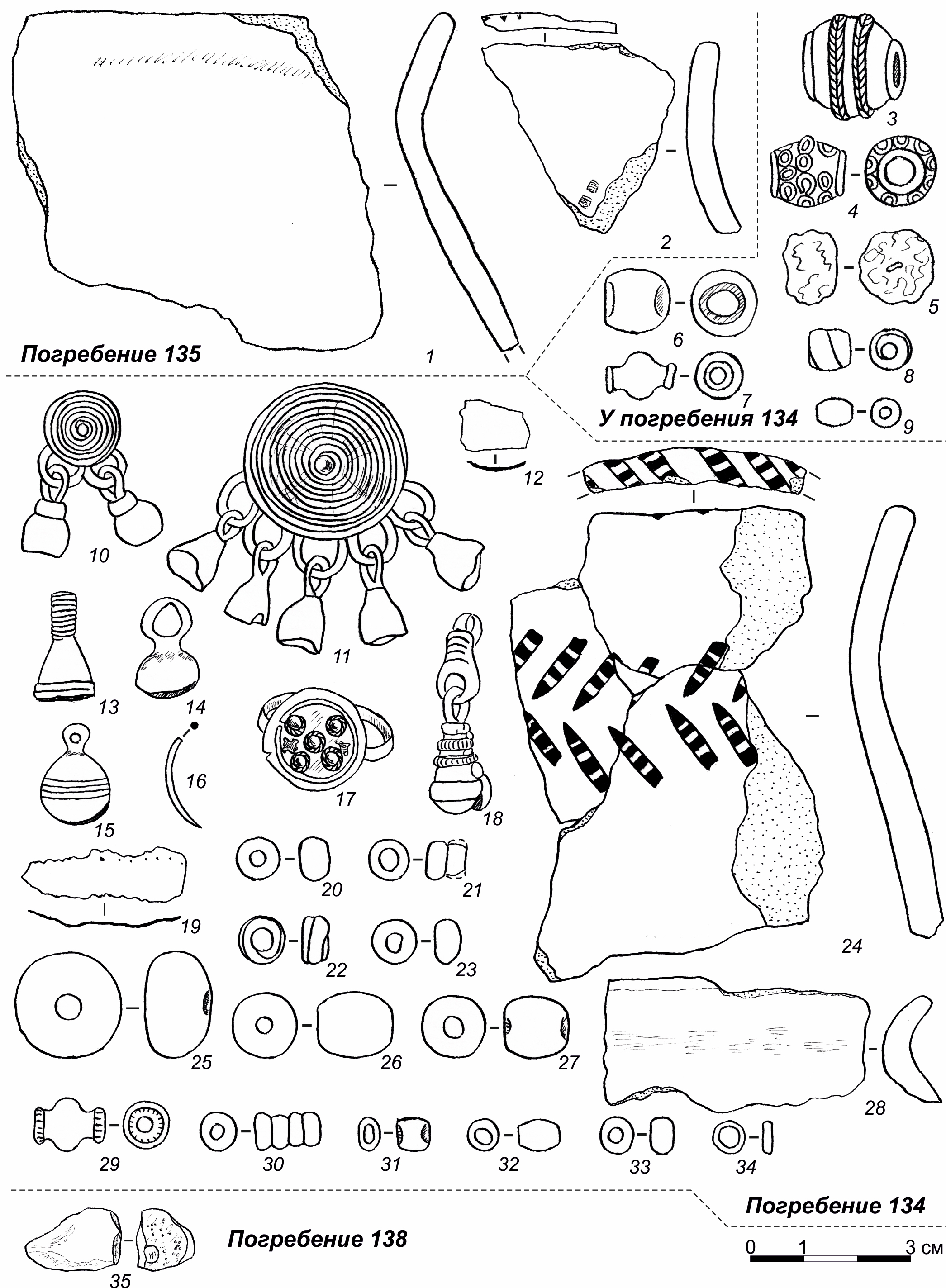 В третью группу входят погребения 134 и 138, также расположенные параллельно. Погребение 134 выделяется богатым набором украшений. Найдены перстень, состоящий из серебряной скано-зерненой круглой бляшки, припаянной на бронзовое пластинчатое кольцо с расплющенными концами (рис. 5, 17), две умбоновидные подвески, большая и малая, к основе первой припаяно пять колец, к которым прикреплены грушевидные привески, ко второй – два кольца с двумя привесками (рис. 5, 10, 11), обломок круглопроволочного височного кольца (рис. 5, 10), три пронизки – спиралевидная, конусовидная гладкая и конусовидная с высокой шейкой, орнаментированная поясками по шейке и нижнему краю, три целых и обломок шаровидного бубенчика с линейной прорезью, грушевидный гладкий с раздутым туловом, грушевидный, орнаментированный гладкими и с насечкой поясками на звене цепочки с орнаментированным щитком (рис. 5, 15, 18), два обломка пластинчатого браслета (или браслетов), по краю одного из них прослеживается точечный орнамент (рис. 5, 19), фрагмент, предположительно, рамчатой пряжки. Погребение отличается богатой коллекцией бус (57 экз.), среди них четыре бронзовые, остальные – стеклянные. Бронзовые представлены двумя кольцевидными и двумя флаконовидными, большой и малой, с валиками по краям, орнаментированными насечками (рис. 5, 29). Среди стеклянных бус преобладают зонные, преимущественно мелкие, кольцевидные, встречены бочонковидные, винтообразные, битрапецоидные, эллипсоидные, цилиндрические, многочастные (рис. 5, 20–27, 30–34). Многие бусы сильно обожжены, некоторые оплавились, потеряли цвет и форму. Кроме украшений в погребении найдены: слиток металла, сильно коррозированный с заостренным концом железный предмет, вероятно, шило, обломки железных предметов и фрагменты двух лепных сосудов. Один толстостенный, с примесью крупнотолченой дресвы в формовочной массе, орнаментированный по торцу венчика наклонными рядами отпечатков зубчатого штампа, по тулову – направленным под углом друг к другу горизонтальным рядом оттисков личинковидного штампа, второй – тонкостенный, неорнаментированный, с органической примесью в формовочной массе, плохого обжига, с отогнутым наружу венчиком и крутым плечиком (рис. 5, 24, 28).