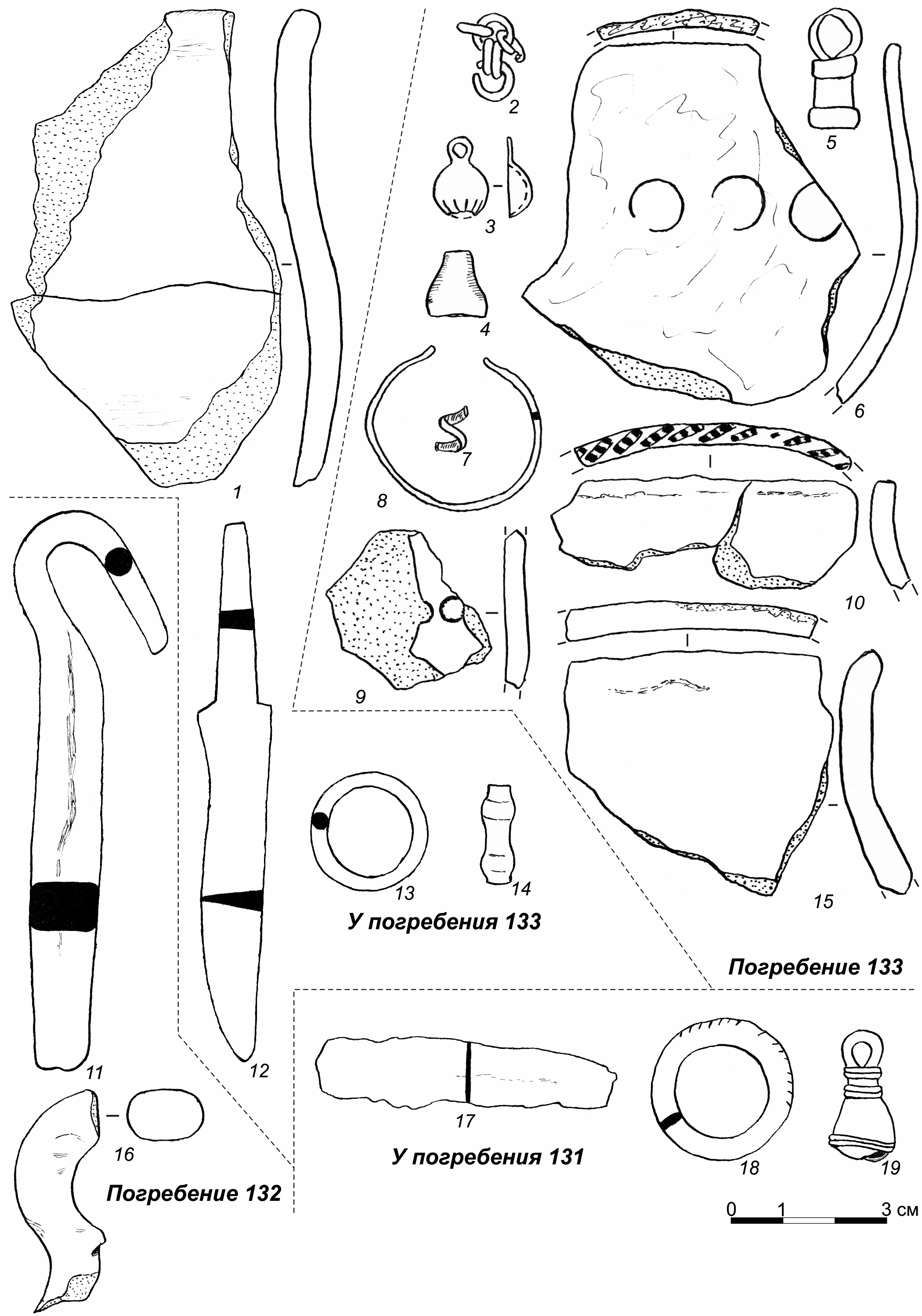 Рисунок 6. Предметы погребального инвентаря. 2-10, 15 – погребение 133; 1, 12–14 – у погребения 133; 11, 16 – погребение 132; 17-19 – у погребения 131.