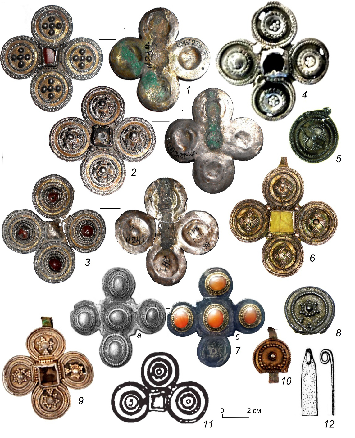 Одной из интересных категорий находок, происходящих из материалов средневековых памятников Пермского Предуралья (родановская археологическая культура), являются подвески крестовидной формы, декорированные зерно-филигранным орнаментом, позолотой и тиснеными полушариями или вставками из поделочных камней и стекла. Несмотря на то, что первые публикации данных изделий и их фрагментов появляются более века назад [1, табл. II-6, XL-7, XXXI-6], детальное изучение этой категории материала не проводилось и в археологической литературе такие находки получили слабое освещение. В настоящий момент времени новые материалы, анализ техники изготовления изделий позволяют обратиться к отдельным моментам появления, распространения и функционирования этой категории изделий.