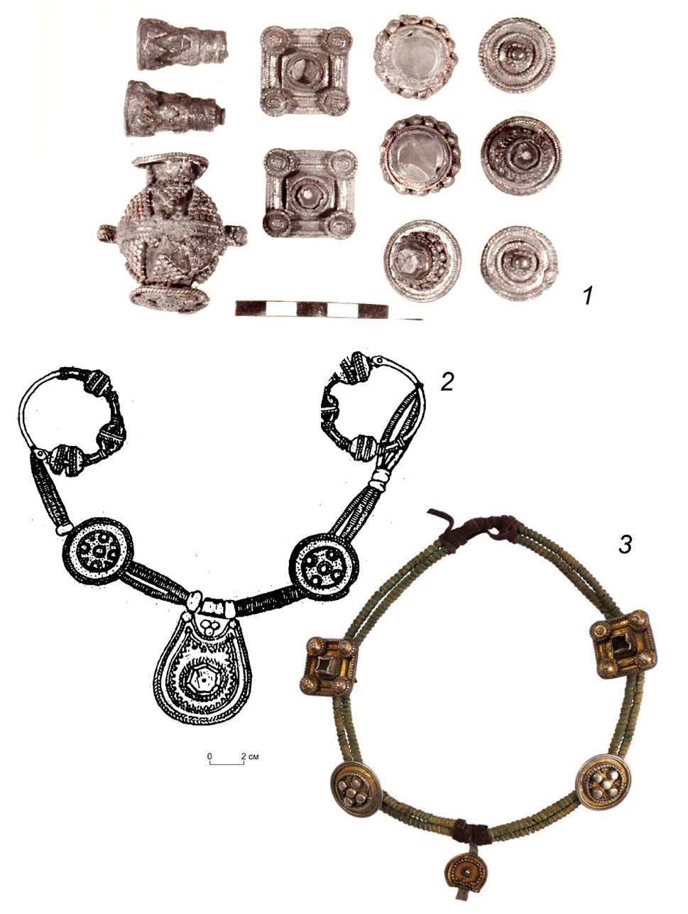 Figure 4. The Vilgort treasure and women’s jewelry sets with grain-filigree elements. 1 – the Vilgort treasure (photos from the archives of the Perm Regional Museum, State Catalog number 37203009, Inventory number A/AA-6631); 2 – the Ydzhydyel burial ground, a frontlet (according to E.A. Savelyeva); 3 – the Perm region, a neck-to-breast decoration (photos from the archives of Yu.A. Podosenova).
