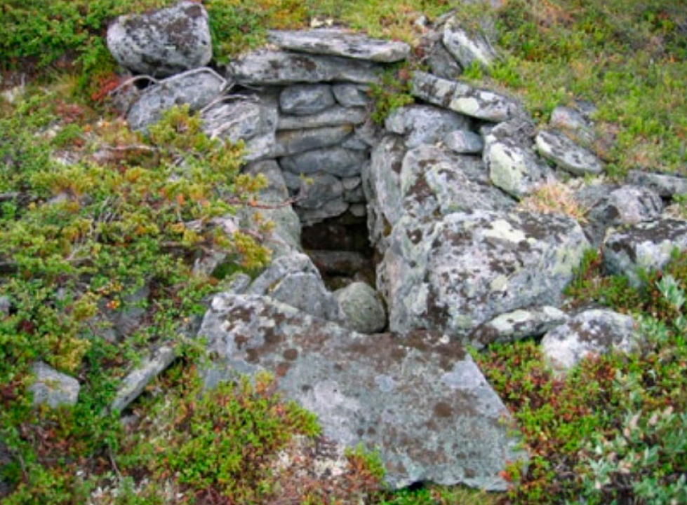 Вторая группа сооружений, определяемая как ловушки, – это немногочисленные «каменные оленьи могилы», находящиеся в высокогорных районах Южной Норвегии (на высоте от 900 до 1200 м над ур. м.). На местности они строились одиночно, с дополнением низкими оградками из камня. По конструкции – это прямоугольной формы (0,5–0,7 х 1,2–2 х 1,3–1,9 м) «каменные ящики», у которых дно и вертикальные стенки тщательно выложены сухой кладкой плитняком [8] 2(рис. 3).