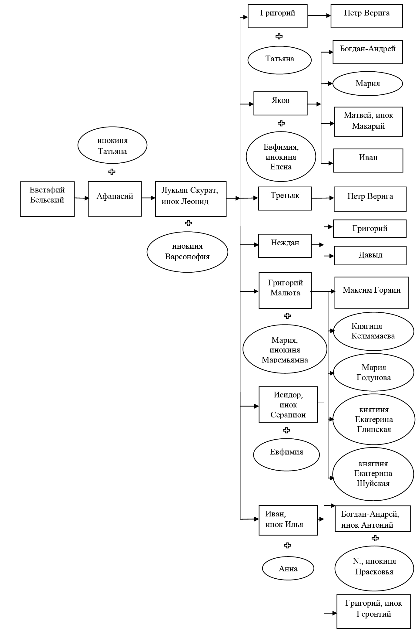 Главный «корм» (большой «корм») по Малюте и его родственникам был установлен 30 сентября – на день памяти священномученика епископа Григория Армянского. Попробуем расшифровать помянник, помещенный в этот день, сопоставив имена с известными по вкладным и приходным книгам, а также другим синодикам [10, л. 41 об., 69 об., 79, 95, 117 об., 147 об., 168, 178, 189, 209, 228; 11, л. 76 об., 77, 78 об., 80 об.]. При расшифровке была использована наиболее полная в настоящее время генеалогическая схема рода Бельских, составленная Н.В. Башниным и А.Л. Корзининым [4, с. 176] (см. схема). В табл. 1 имена приведены в родительном падеже, как в тексте помянника.