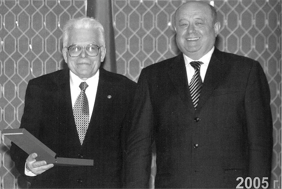 Председатель Правительства Российской Федерации М.Е. Фрадков вручает М.П. Рощевскому (руководителю работы) Государственную премию Российской Федерации 2003 г. в области науки и техники за работу «Эволюционная электрокардиология: хронотопография возбуждения сердца позвоночных». Москва, Дом Правительства, 28 июня 2005 г. Из кн.: Рощевский, М.П. Избранные труды. В 4-х т. / М.П. Рощевский. – Сыктывкар, 2013. – Т. IV. (3 вклейка).