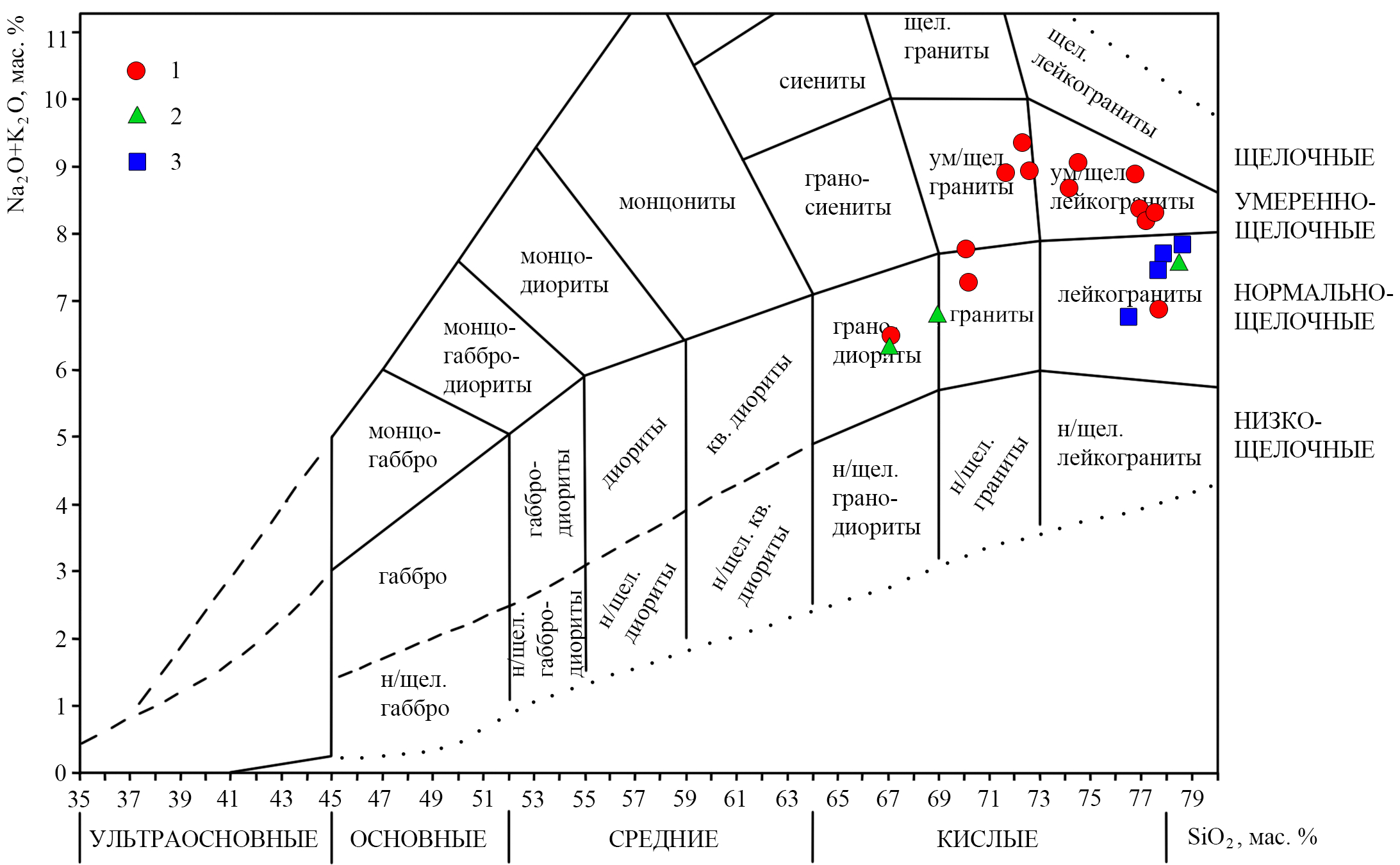 Рисунок 2. Положение гранитоидов Хомутинского, Южно-Хомутинского массивов, Пещернинского штока на классификационной диаграмме K2O+Na2O-SiO2 (TAS) [16]. Условные обозначения: 1 – породы Хомутинского массива, 2 – породы Южно-Хомутинского, 3 – породы Пещернинского штока.