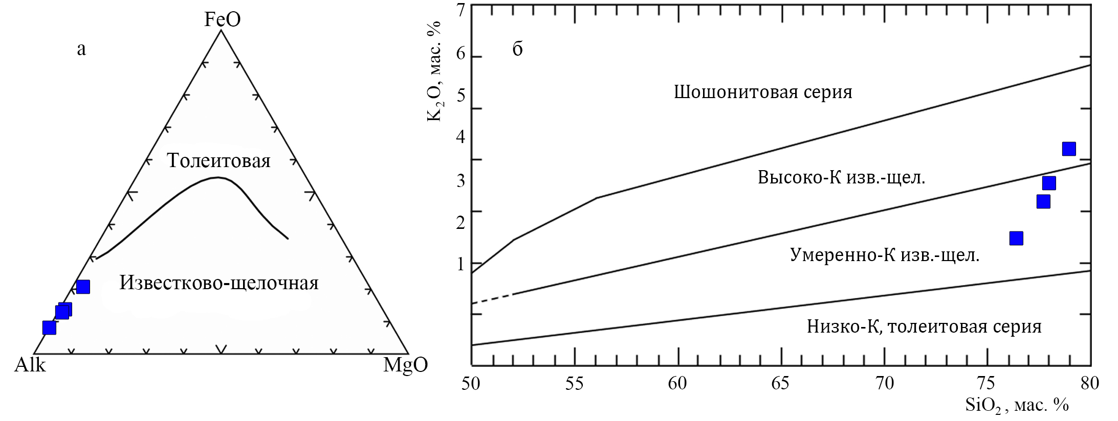 Рисунок 3. Положение гранитоидов Пещернинского штока (отмечены фигуративными точками) на классификационных диаграммах: а – диаграмма AFM [18] для разделения пород толеитовой и известково-щелочной серий; б – диаграмма А. Печерилла и С.Р. Тейлора [19] для разделения пород по содержанию калия.
