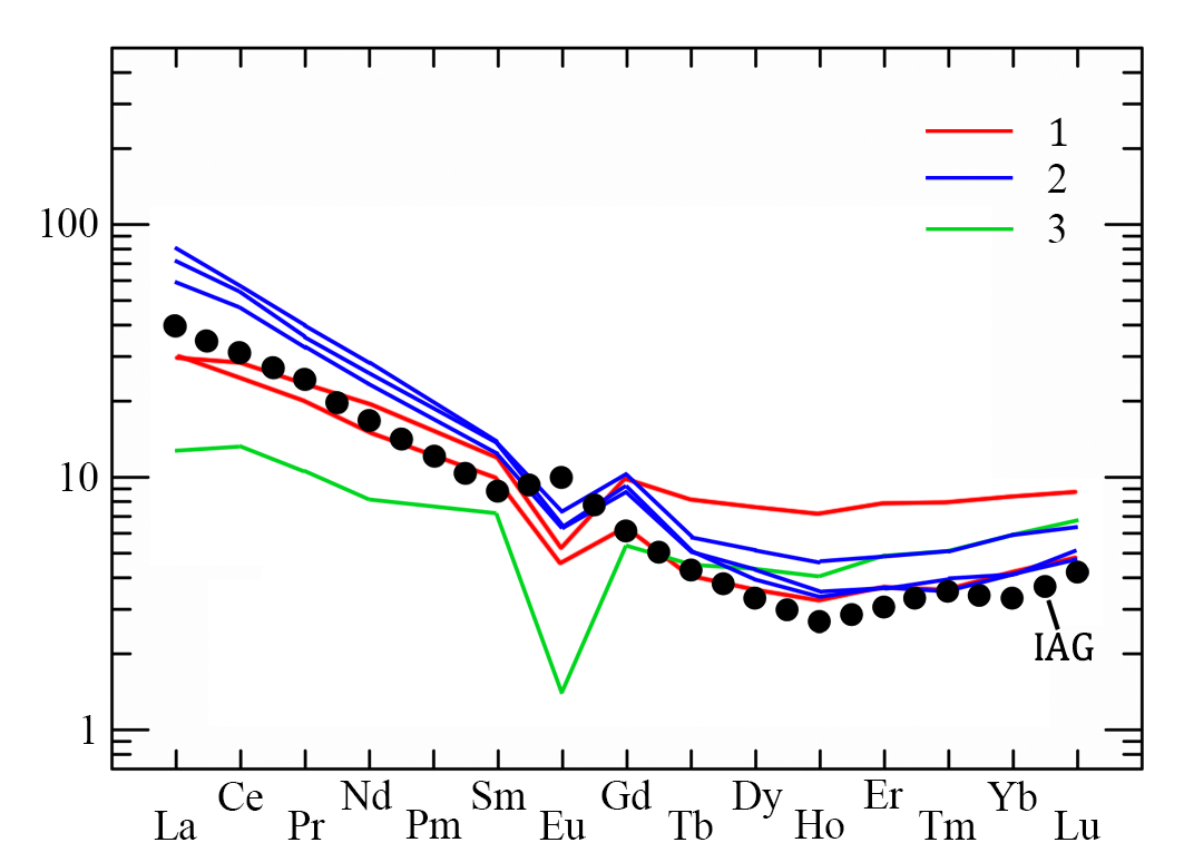 Рисунок 4. Нормированное по хондриту [20] распределение редкоземельных элементов в гранитоидах Хомутинского массива и Пещернинского штока, сравнение с гранитами островных дуг (IAG) [28]. Условные обозначения: 1 – граниты Хомутинского массива; 2 – лейкограниты Пещернинского штока; 3 – аплит Пещернинского штока.
