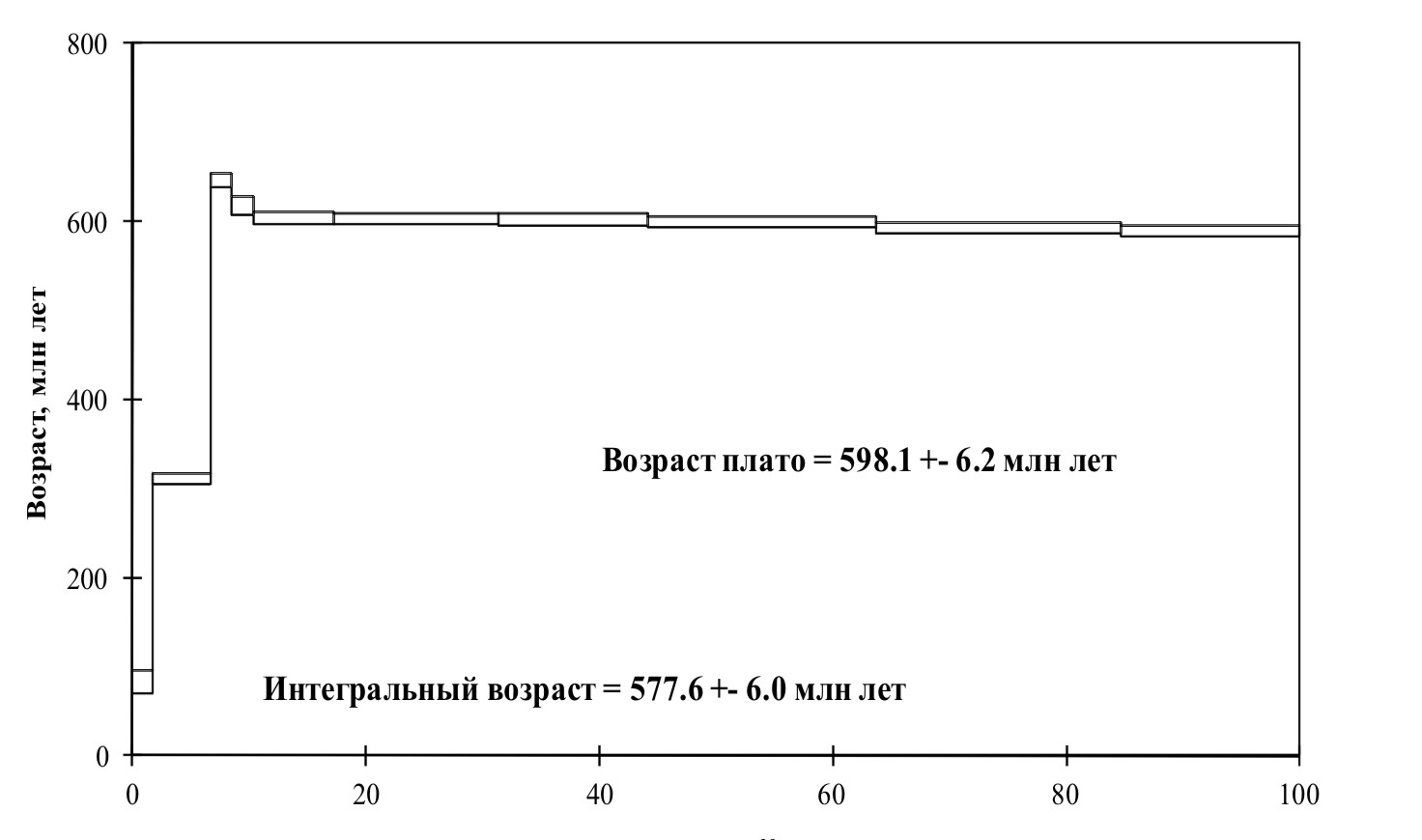 Результаты геохронологического датирования даны в табл. 5 и на рис. 6. В возрастном спектре выделяется плато c возрастом 598.1 ± 6.2 млн лет. Авторы рассматривают близодновременное образование флогопита в ходе эволюции единого процесса кристаллизации ультраосновного расплава. Полученные данные согласуются с данными, полученными для пород четласского комплекса [20].