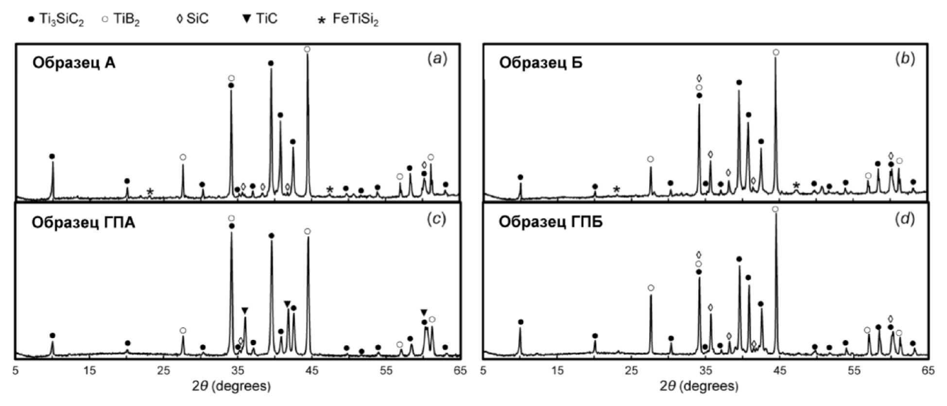 Исследование динамики уплотнения продуктов карбосиликотермического восстановления ЛК показало, что их спекание происходит равномерно. Отличительной особенностью спекания порошков различного состава является то, что процесс уплотнения порошков начинается при разных температурах. В частности, порошок, содержащий только Ti3SiC2, начинал уплотняться в интервале температур 1380–1390 °C, а композиционный состав с карбидом кремния SiC и диборидом титана TiB2 – при температурах 1050–1200 °C. На рис. 4 и 5 представлены микроструктуры керамических образцов, полученных методом горячего прессования. Установлено, что процесс спекания образцов с низким содержанием SiC сопровождался образованием TiC вследствие частичного разложения Ti3SiC2. В образцах, состав которых включал значительную долю SiC, разложение Ti3SiC2 не наблюдалось, что обусловлено стабилизирующим эффектом, связанным с общим увеличением термодинамической активности кремния в присутствии SiC. РФА образцов после проведения горячего прессования показаны на рис. 1, c, d.