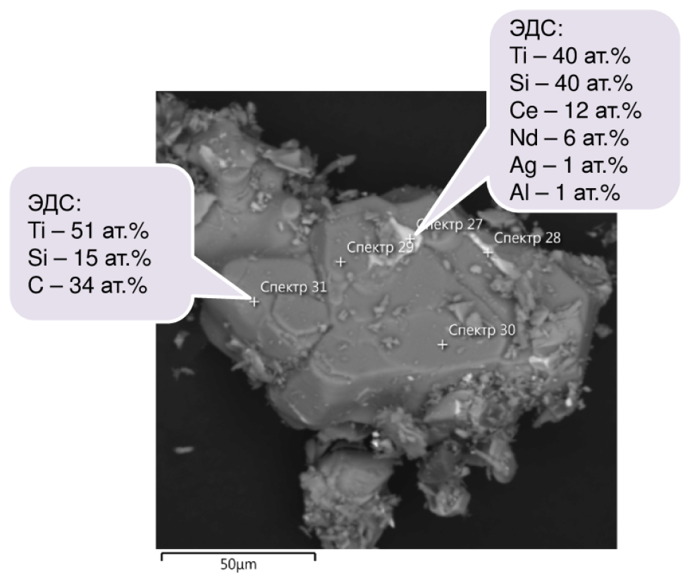 Рисунок 2. Микроструктура и ЭДС анализ продуктов карбосиликотермического восстановления ЛК. Светлая область – примесная интерметаллидная фаза. Темно-серая область отвечает составу МАХ-фазы Ti3SiC2.