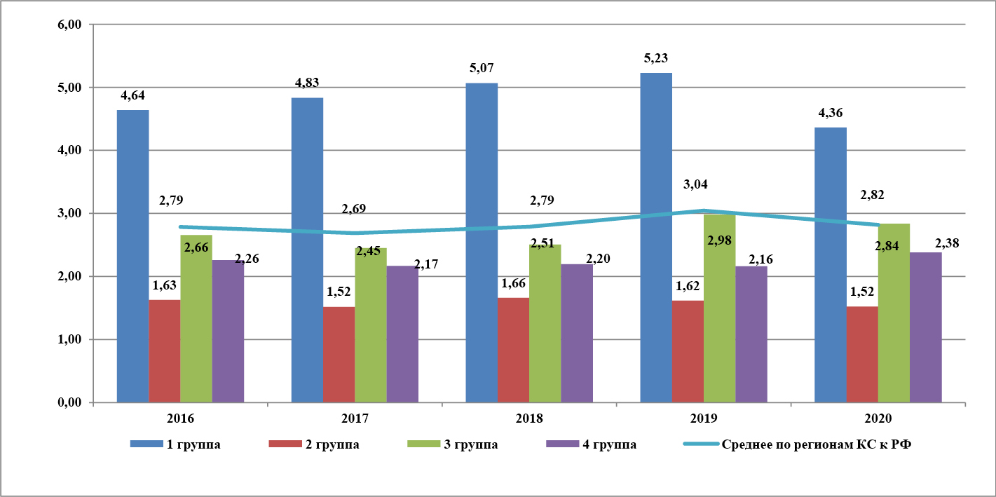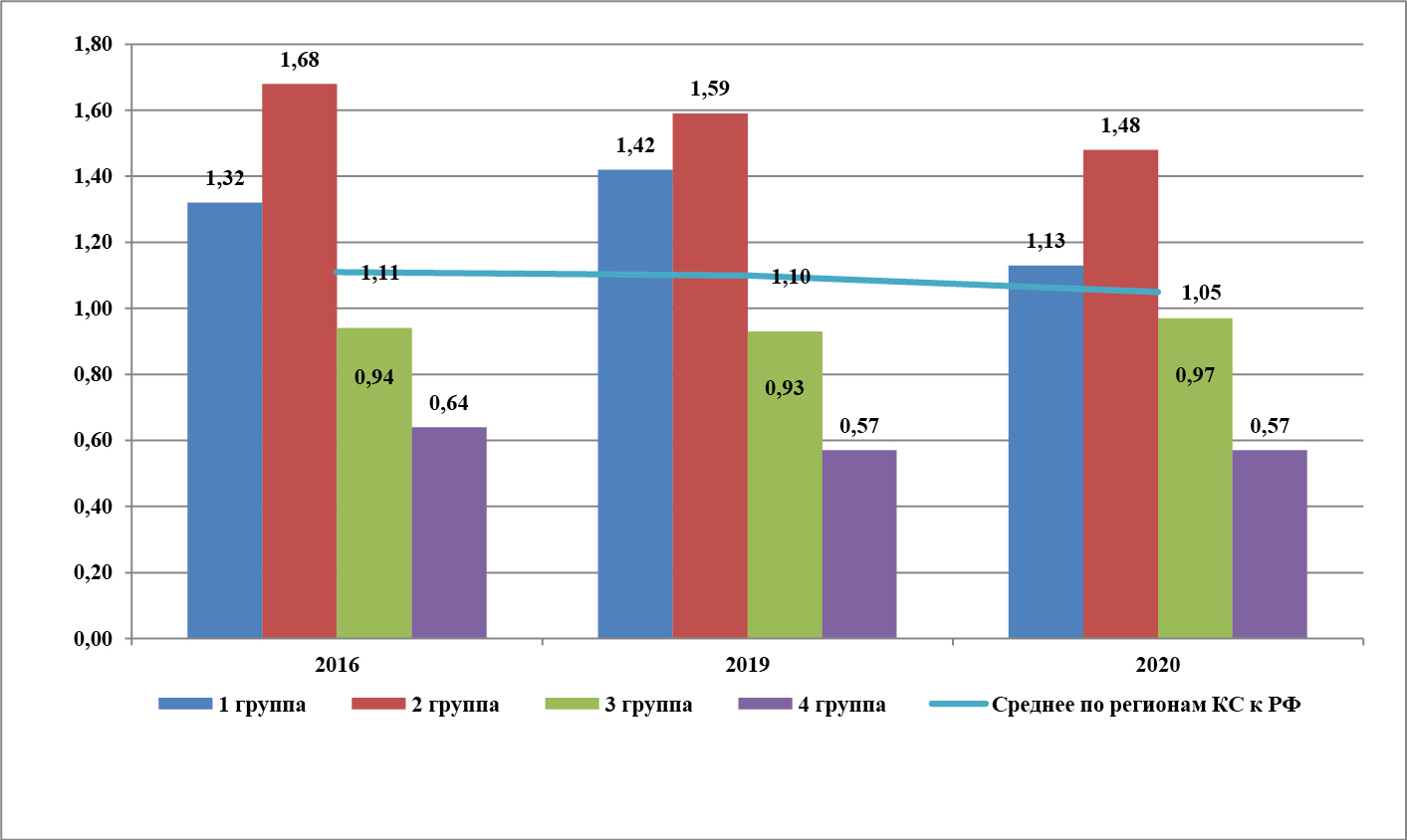 Среднее по регионам КС относительно среднего по РФ | 1,12 | 1,26 | 1,02 | 0,92 | 0,97 |