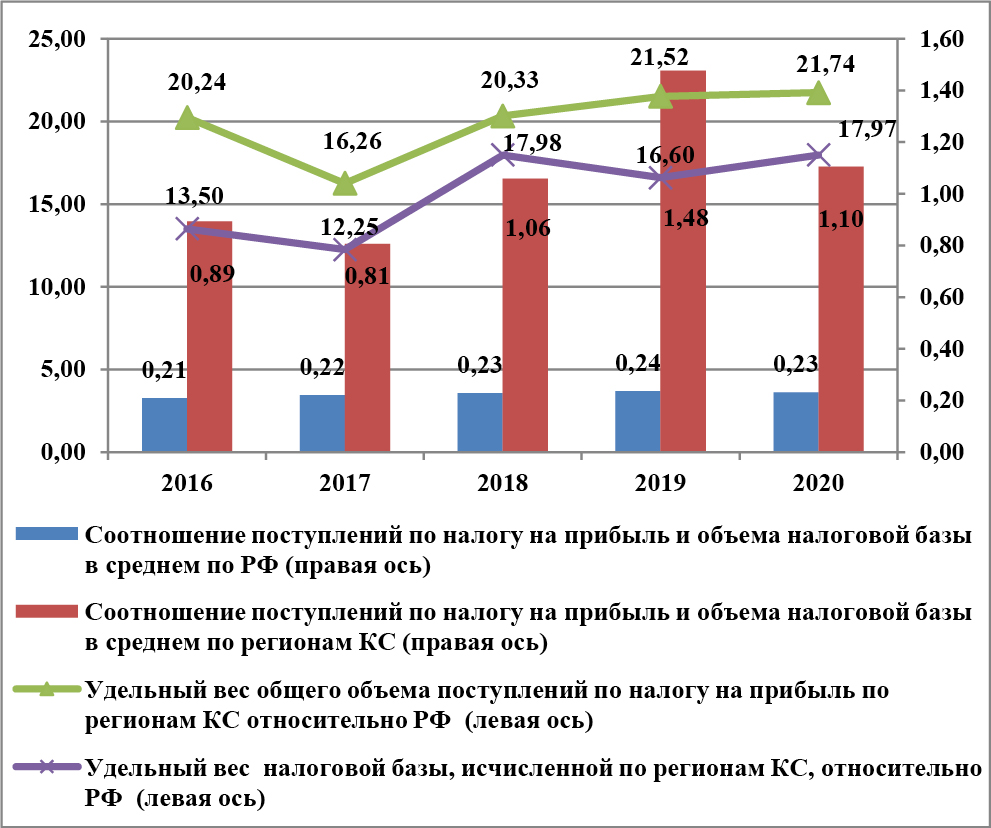 Результативность налоговых усилий в регионах КС в целом выше, чем по РФ. Лидерство среди регионов КС по уровню исчисленного коэффициента сохраняют Ненецкий АО, Сахалинская и Мурманская области, Республика Коми. Вместе с тем в пяти регионах отмечалось снижение коэффициента налоговых усилий к 2019 г. по причине превышения темпов роста налоговой базы над темпами роста поступлений по налогу на прибыль. Так, в Ямало-Ненецком АО налоговая база за анализируемый период выросла в шесть раз, а налог увеличился в 2,9 раза, в Сахалинской области – в 1,72 и 1,67, Ханты-Мансийском АО – в 1,63 и 1,48, Красноярском крае – в 3,02 и 2,2, в Магаданской области – в 1,07 и 0,93 раза соответственно. Недопоступление налога вызвано предоставлением федеральных и региональных льгот крупным хозяйствующим субъектам. Так, например, в Ханты-Мансийском АО объем выпадающих доходов в связи с предоставлением льгот составил 30,9 % к поступившему налогу на прибыль, в Ямало-Ненецком АО – 17 % [15]. За 2016–2020 гг. снижение показателя налоговых усилий произошло также в Архангельской области, Республике Карелия и Хабаровском крае. В 2020 г. коэффициент налоговых усилий понизился по сравнению с 2019 г. как в целом по РФ и регионам КС, так и в разрезе групп (табл. 6). Налоговая база за год пандемии составила 98 %, а объемы поступившего налога на прибыль – 89 % уровня 2019 г.