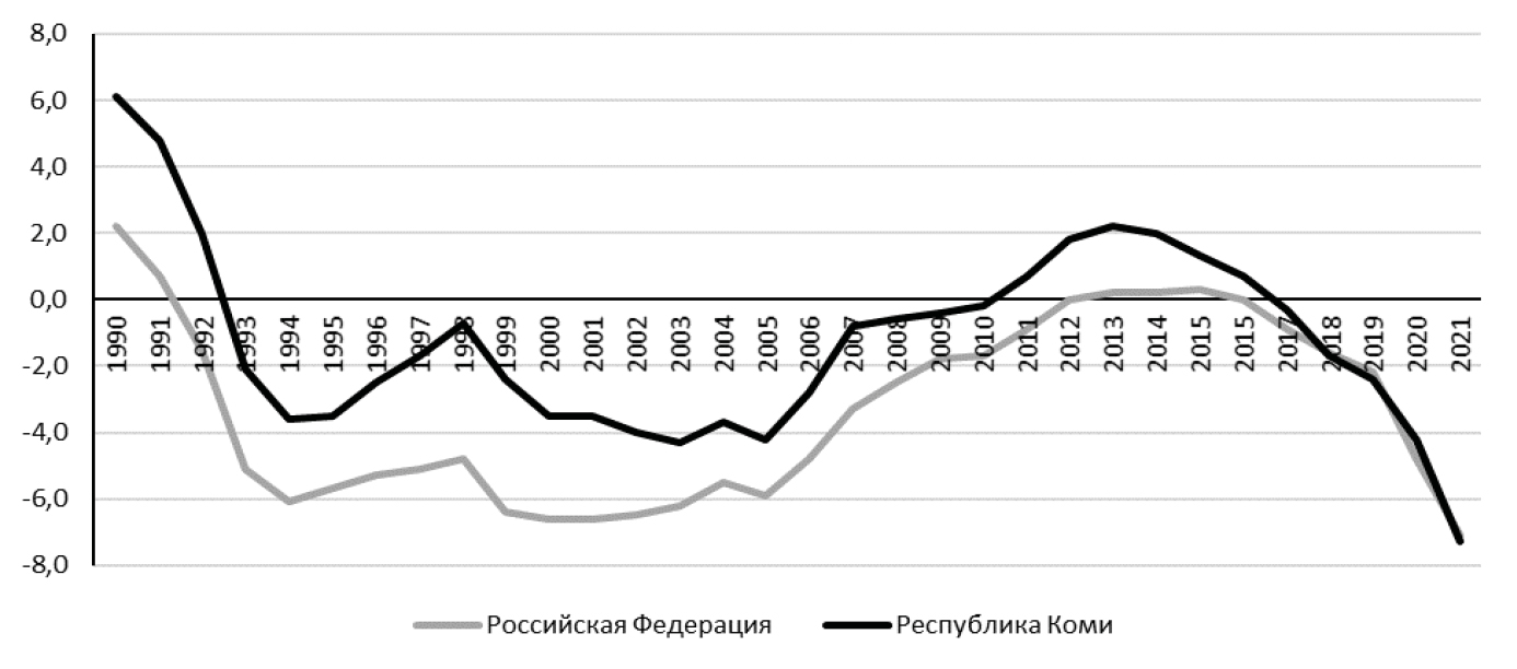 Figure 1. Dynamics of the total natural population growth rate in the Russian Federation and the Komi Republic for 1990-2021, ‰.