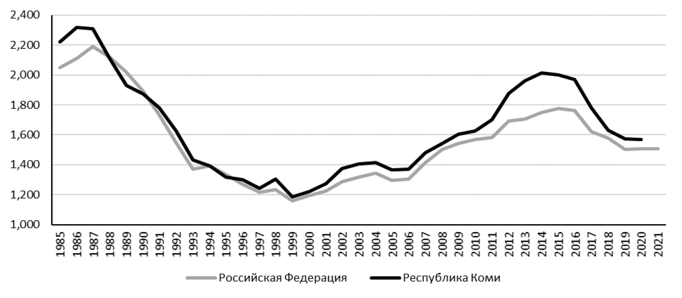 В Республике Коми величина суммарного коэффициента рождаемости до второй половины 1980-х гг. заметно превышала общероссийский уровень (рис. 2). К концу 1980-х–началу 1990-х гг. у коми, составляющих около четверти населения республики, завершился переход к малодетности [18, c. 189–204]. После этого примерно до середины 1990-х гг. рождаемость в Коми была лишь очень незначительно выше уровня в целом по стране, а на протяжении 1988–1990 и 1994–1995 гг. величина суммарного коэффициента была ниже среднероссийской.