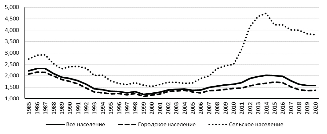 Рисунок 3. Динамика суммарного коэффициента рождаемости городского и сельского населения Республики Коми в 1985–2020 годах, детей на одну женщину за весь ее репродуктивный период.