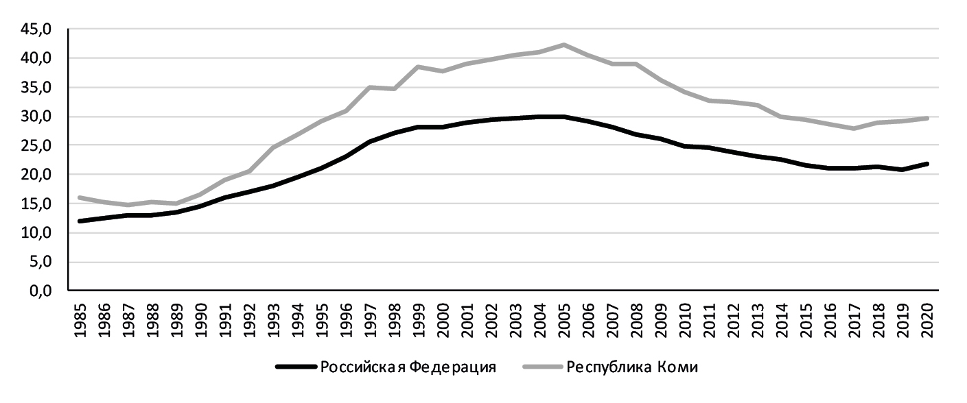 Значительнее среднероссийского в Республике Коми и отставание мужской продолжительности жизни от женской, что также можно считать дополнительным резервом роста уровня регионального показателя. В целом по стране в последние годы мужское отставание меньше 10 лет, в Республике Коми – в районе 11. Смертность от коронавирусной инфекции, вызванной COVID-19, у женщин оказалась выше: в 2020 г. ее доля в общей структуре женской смертности составила 7,1 % против 5,8 % в мужской, в 2021 г. 22,0 % против 15,1 %. Очевидно, что дело не только в более старой возрастной структуре женщин, поскольку превышение наблюдается и в трудоспособном возрасте: в 2020 г. 5,4 % смертей в структуре женской смертности в трудоспособном возрасте были от коронавирусной инфекции по сравнению с 3,3 % в структуре мужской, в 2021 г. 15,4 % по сравнению с 9,8 % [5, с. 44–47]. Однако, на наш взгляд, это прежде всего связано с существенно более высокой преждевременной смертностью мужчин от всех других причин: абсолютные показатели мужской смертности в трудоспособном возрасте в 2020–2021 гг. в 3,5–4 раза превосходят женские, в том числе и от COVID-19 – выше более чем в два раза. Но вопрос нуждается в более глубоком изучении.