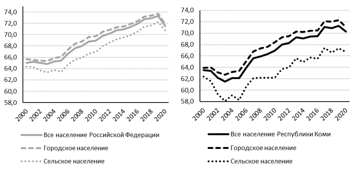 Figure 6. Dynamics of the life expectancy of urban and rural population in the Russian Federation and the Komi Republic for 2000-2020, years.