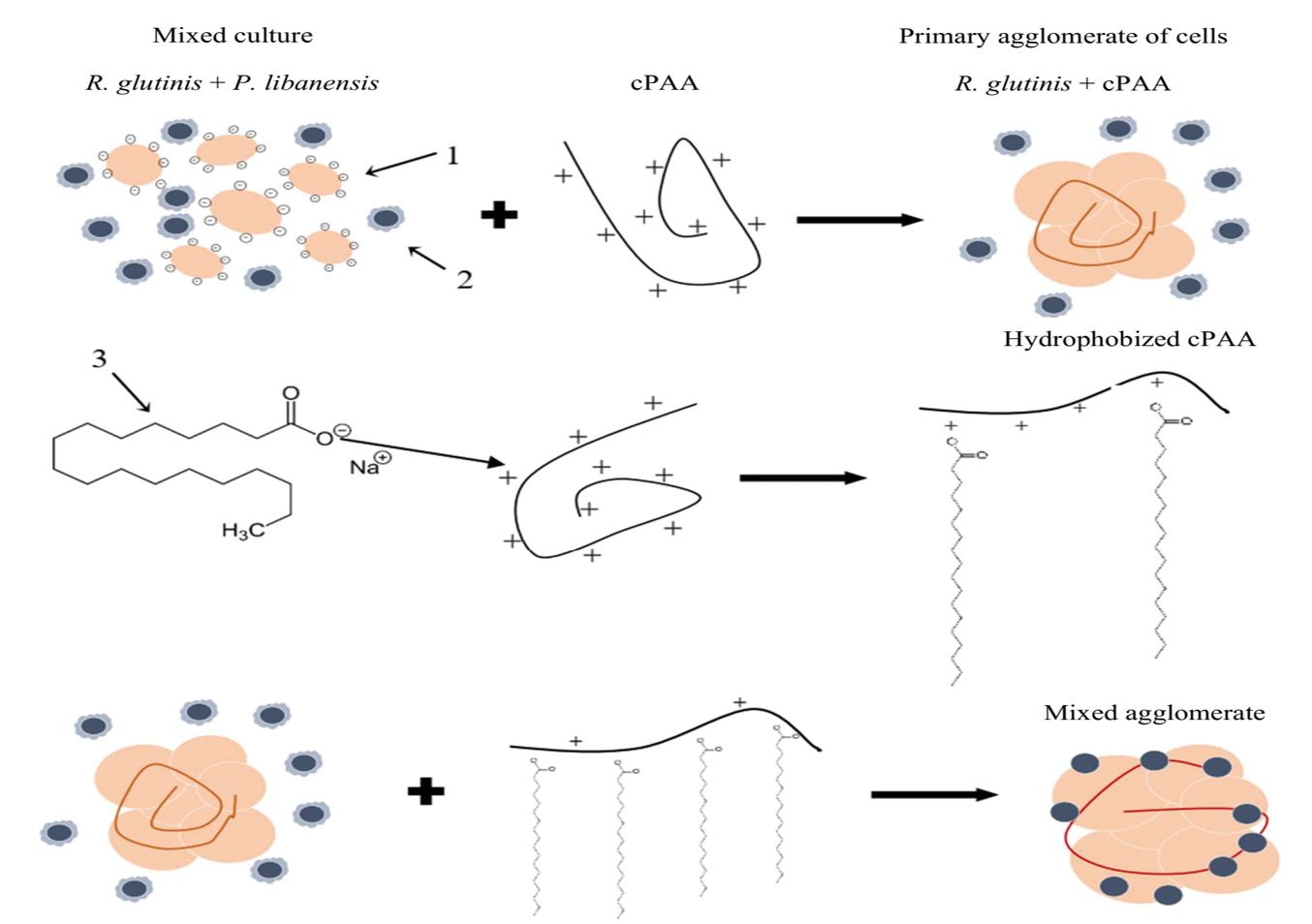 There are certain difficulties in obtaining concentrated biomass with the use of such polyelectrolytes as cPAA for the P. libanensis bacterial culture. Some species of the Pseudomonas genus and many other oil-degrading bacteria are known to be able to synthesize biosurfactants that facilitate the diffusion of hydrocarbons into cells [11]. Biosurfactants are usually glycolipids or lipopolysaccharides [12], shielding from charged particles, and therefore the cells are sufficiently inert to polyelectrolytes like hydrophilic ionic polyacrylamides. To form the concentrated bacterial biomass, we proposed to use combinations of cPAA and salt based on alkali metal and higher fatty acid (SAF). The cPAA contains usually a tertiary amine as a cationic group, a chloride or methyl sulfate group as an anion. If the polymer used is mixed with SAF, ion exchange occurs resulting in cPAA acquirement of fatty acid residues and formation of water-insoluble complex with bacteria cells captured. Due to the hydrophobic nature of complexes obtained it is more reasonable to use the flotation method. In our case, solution of sodium salt of stearic was used as the commercially available hydrophobic modifier of cPAA.