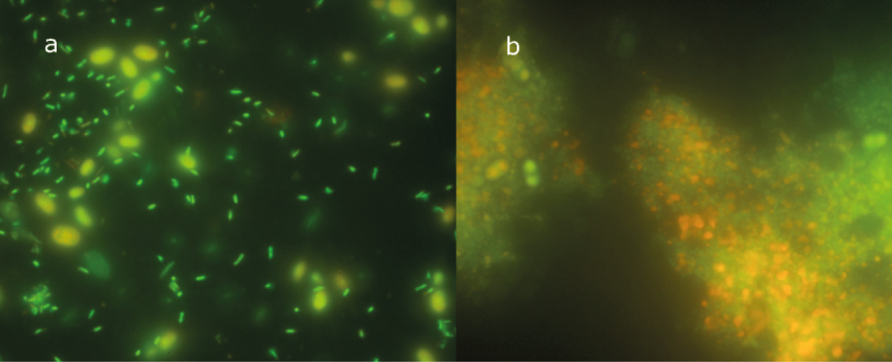 Рисунок 2. Микрофотография R. glutinis and R. libanensis в смешанной культуре (a) и агломераты клеток (b). Возбуждение при λ=450÷480 нм, зона излучения при λ=500÷600 нм.