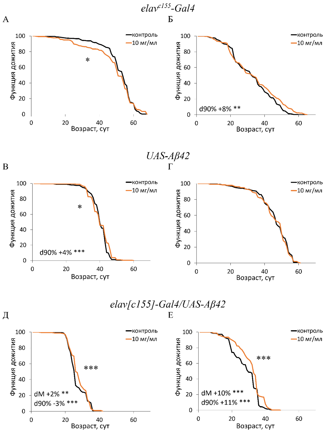 Рисунок. Влияние экстракта черноплодной рябины на продолжительность жизни самцов (А, В, Д) и самок (Б, Г, Е) дрозофил с моделью болезни Альцгеймера. dM – разница в медианной продолжительности жизни; d90 % – разница смертности в возрасте 90 %.,