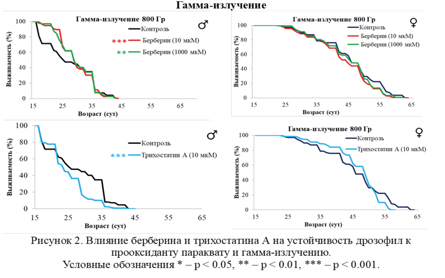 Ранее проведенные исследования показали положительное действие берберина и трихостатина А на ПЖ дрозофил и других модельных животных [24-30], но влияние данных веществ на устойчивость организма к генотоксическим факторам не описано. В данной работе мы исследовали влияние берберина и трихостатина А на продолжительность жизни и устойчивость Drosophila melanogaster к γ-излучению и прооксиданту параквату.