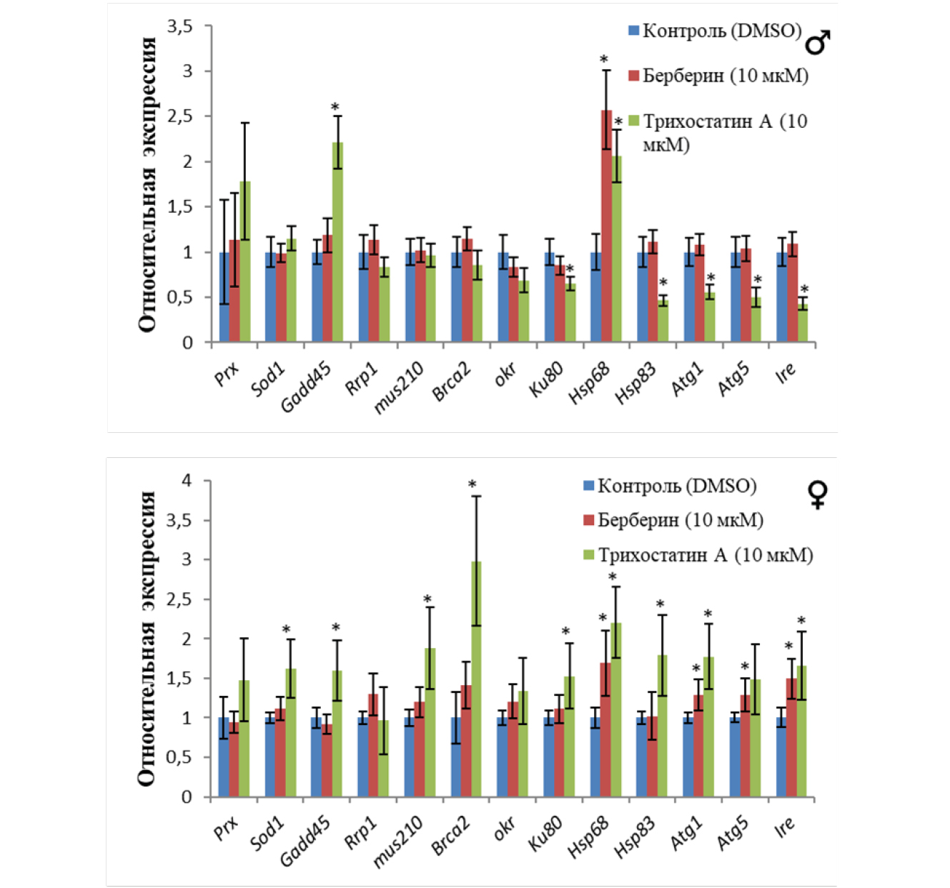 Оценку транскрипционной активности генов стресс-ответа проводили с применением метода ПЦР «в реальном времени» с этапом обратной транскрипции. Для каждого варианта эксперимента отбирали 10 особей каждого пола, которых предварительно содержали на среде с 0.2 % DMSO (контроль) или исследуемыми веществами в течение 15 сут.