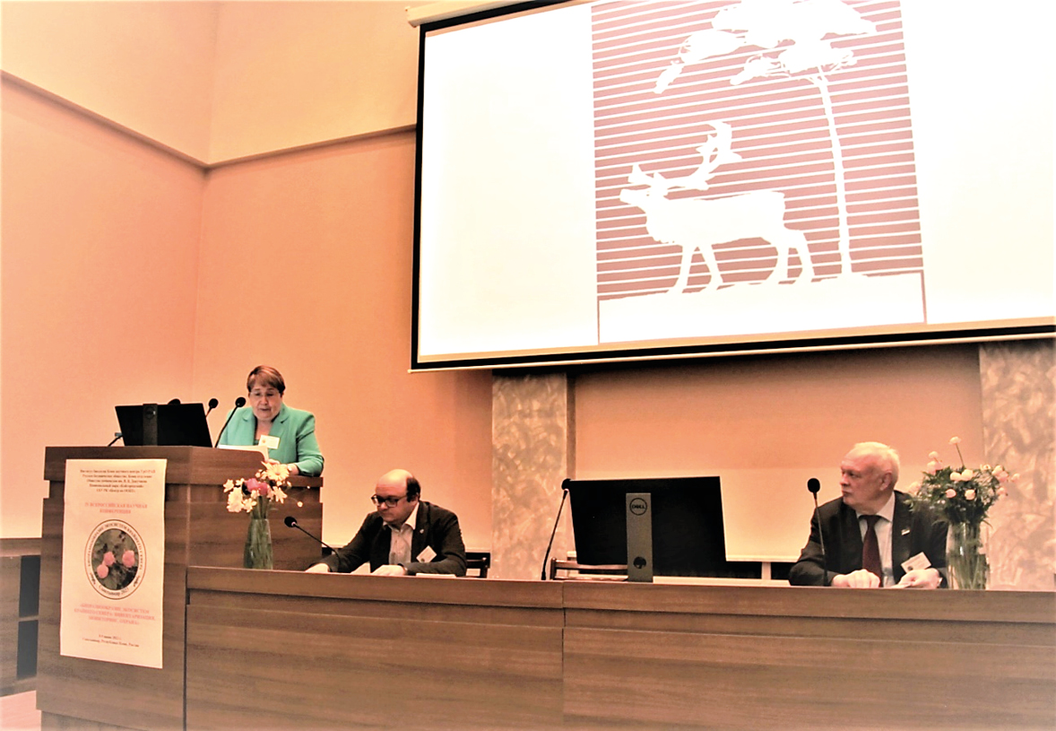 Photo 2. Opening the plenary session of the Conference. The speaker is Chair of the Program Committee of the Conference, Corresponding Member of the Russian Academy of Sciences, Doctor of Biology S.V. Degteva, then fron left to right the members of the Program Committee: on the left - Corresponding Member of the Russian Academy of Sciences, Doctor of Biological Sciences I.N. Bolotov, on the right - Chairman of the State Council Committee of the Komi Republic on Natural Resources, Nature Management and Ecology A.N. Popov.