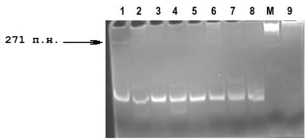 Рисунок 1. Гель-электрофорез в 6 %-ном нативном полиакриламидном геле, продуктов реакции ОТ-ПЦР на наличие вируса PVY. Дорожки 1–8 – реакции с образцами картофеля №№ 1–8; № 9 – отрицательный контроль; М – маркер длин фрагментов ДНК (Сибэнзим). Ожидаемый размер ПЦР-продукта PVY – 271 п.н.