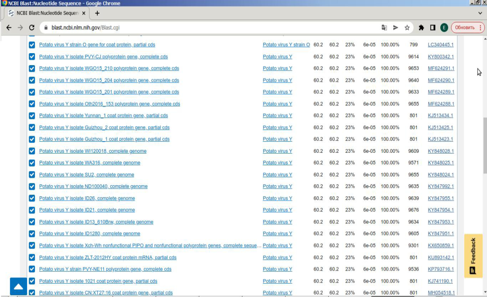 14 | Potato virus Y isolate P097, complete genome | MT264732 |