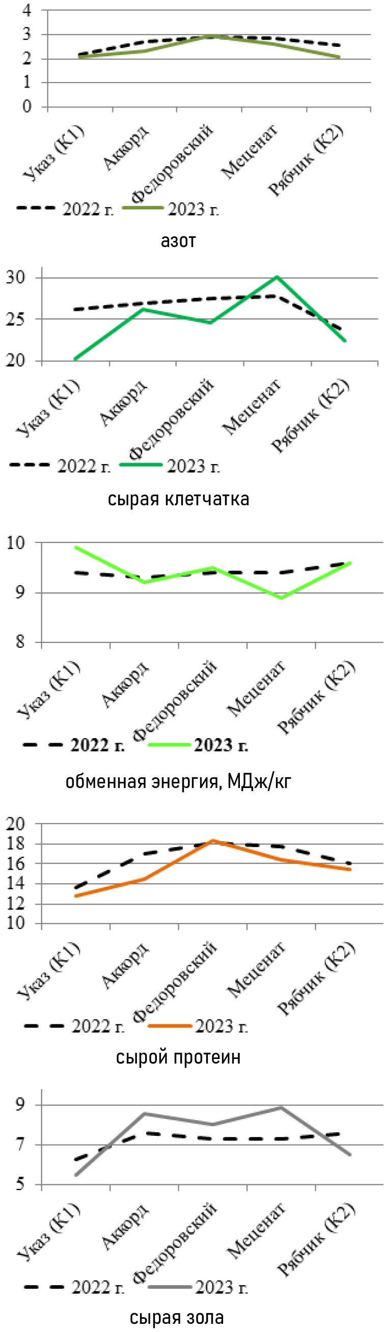 Значимых отклонений по обменной энергии в 2022 г. между изучаемыми сортами не отмечено – уровень 9.3–9.6 МДж/кг (рис. 3). Последующий год показал, что количество обменной энергии у сортов люпина (на 4–10 %) и пелюшки Рябчик (на 3 %) снизилось в относительных единицах по сравнению с контролем Указ, хотя средневзвешенный уровень по опыту остался таким же – 9.4 МДж/кг.