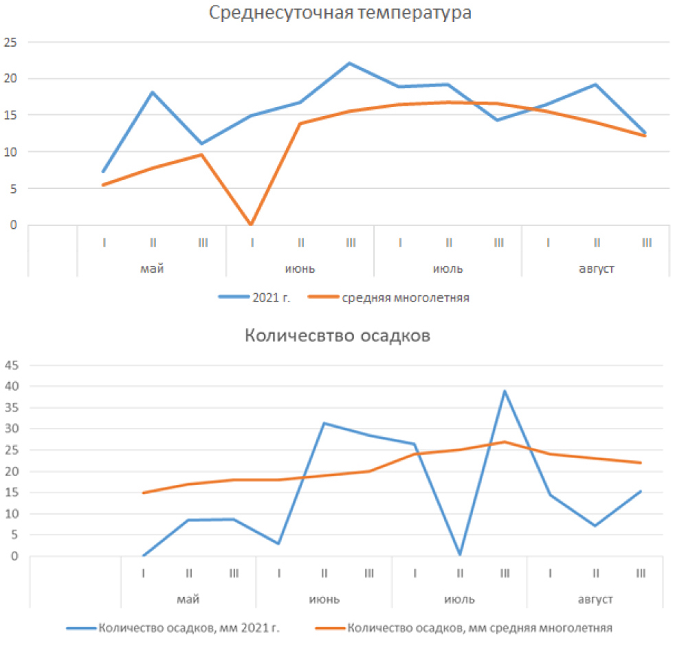 Характеристика метеорологических условий в 2021 и 2022 гг. выполнена на основании данных, предоставленных Центром по гидрометеорологии и мониторингу окружающей среды г. Сыктывкара. Метеоусловия вегетационного периода 2021 г. заметно отличались от многолетних наблюдений как по температуре воздуха, так и по атмосферным осадкам (рис. 1). Так, среднесуточная температура воздуха в целом за вегетационный период была на 2.7⁰ (120 %) выше средней многолетней. При этом резких перепадов не отмечено.