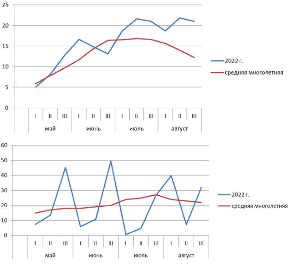 В первой декаде июня преобладала сухая и солнечная погода со средней температурой воздуха +16.6 ⁰С, что выше средней многолетней нормы на 4.9 ⁰С. Вторая декада июня характеризовалась неустойчивой, с количеством осадков 12.3 мм, в третьей декаде июня наблюдали относительно теплую (13.1 ⁰С) погоду. Средняя температура за вторую и третью декады составила +14.8 и +13.1 ⁰С. В целом за июнь 2022 г. средняя температура была +14.8 ⁰С, что на 0.6 ⁰С выше средней многолетней нормы.
