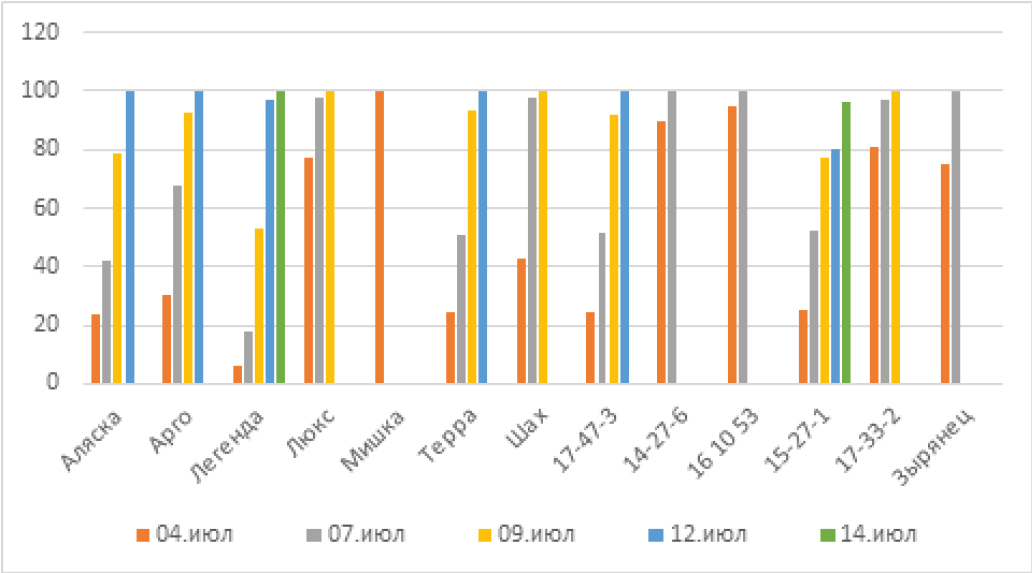 Фенологические наблюдения дают возможность установить время отдельных фаз развития растений. Проведенные в 2021 г. исследования показали отсутствие всходов на 10-й день с момента посадки картофеля (28.05.2021). На 19-й день наблюдали дружные всходы практически на всех делянках, за исключением сорта Легенда (28 %), в то время как сорт Мишка и с/о 15-27-1 показали всхожесть 100 % – так же, как сорт Зырянец, выступавший в качестве стандарта. Наименьшая всхожесть была выявлена у сортов Арго – 77.5 и Аляска – 69.2 %. На 28-й день 100 %-ной всхожести не достигли сорта: Аляска, Люкс и с/о 17-33-2 – по 97 % каждый.