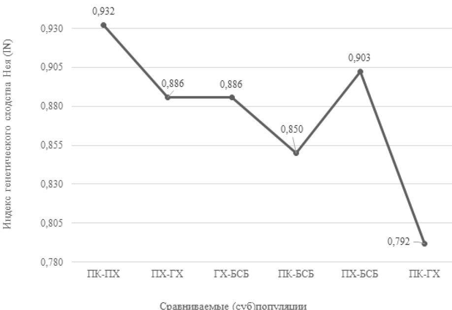 Figure. Ney’s indices of genetic similarity (IN) according to frequencies of EAB-locus of blood groups on the pairwise comparison of (sub)populations of the purebred Kholmogory cattle in the Komi Republic.
