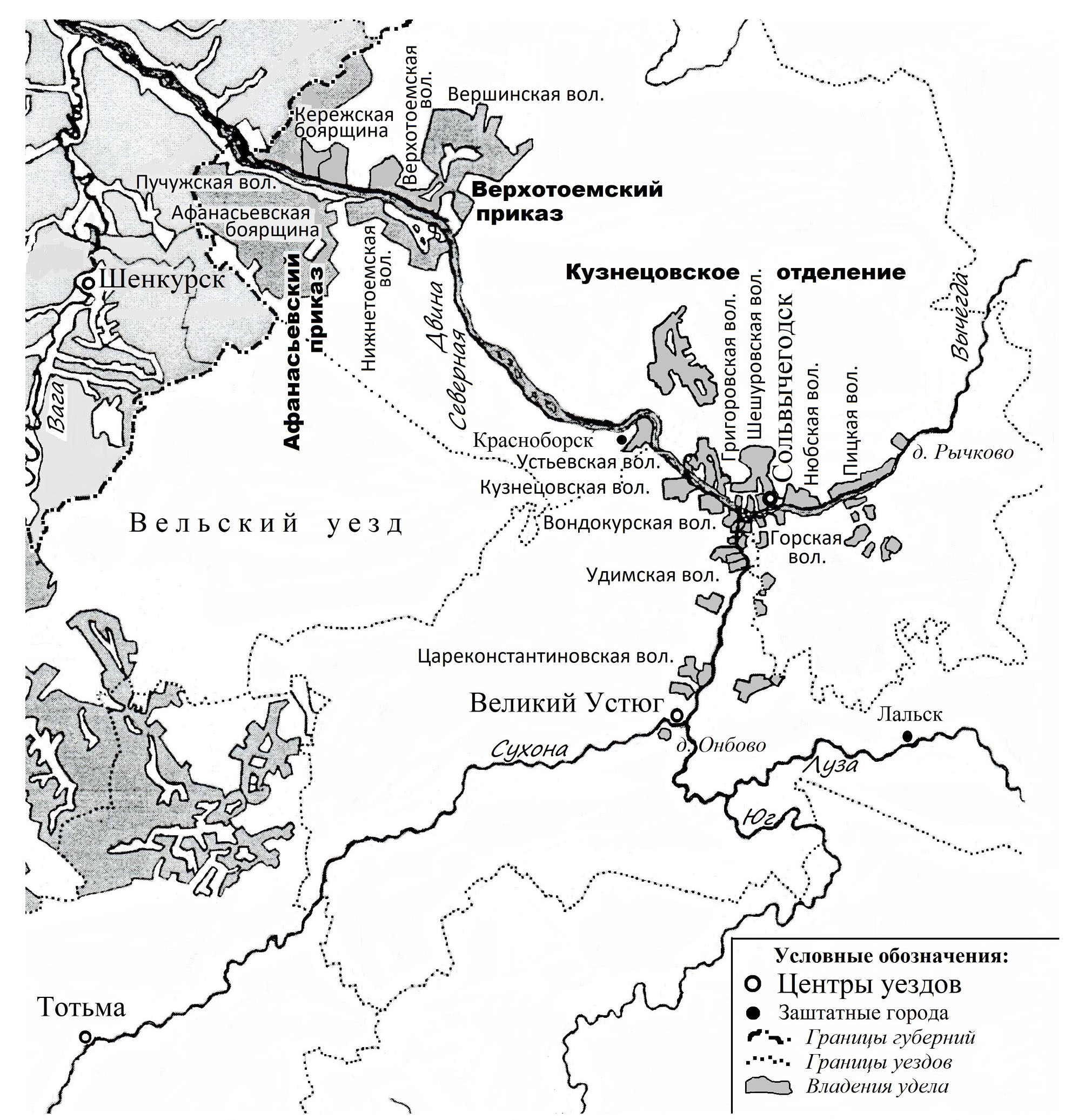 В ходе реформирования удельного ведомства в 1808 г., наряду с другими изменениями, была прекращена практика разделения волостей, как и существование межгубернских приказов. Как отражено на карте (см. рис. 1), на традиционной дворцовой собственности Сольвычегодского уезда удел сформировал: Афанасьевский приказ в составе Кережской боярщины, Пучужской волости и Афанасьевской боярщины; Верхотоемский приказ в составе Верхотоемской волости Верхнего конца, или Верхотоемской волости, Верхотоемской волости Нижнего конца, или Нижнетоемской и Вершинской волостей.