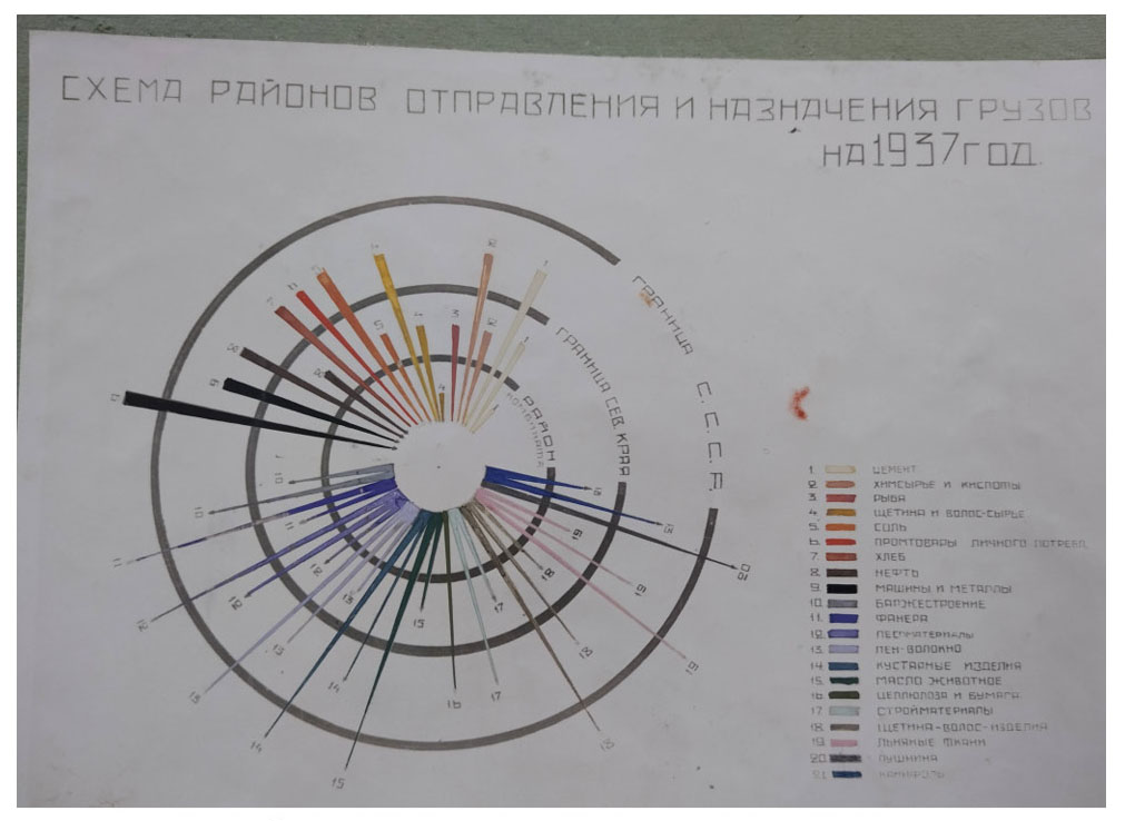 Note: The diagram contains data on the planned categories of cargo (cement, chemical raw materials and acids, fish, bristles and hair raw materials, salt, manufactured goods for personal consumption, bread, oil, machinery and metals, barge construction, plywood, timber, flax fiber, handicrafts , animal oil, pulp and paper, building materials, linen fabrics, furs, rosin) and areas of their departure (mill area, border of the Northern Territory, border of the USSR).