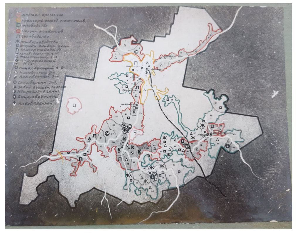 Note: On the map, types of national economic activities and enterprises are marked with letters and symbols (handicrafts, livestock farming, grassland farming, gardening, potato growing, flax processing plants, milk condensation plants, oil mills, distilleries and breweries, MTS, etc.).